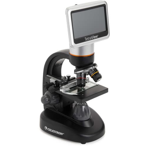 Rock your field trip, lab, or classroom with the TetraView 5.0MP Cordless Digital Microscope from Celestron. This full-size digital microscope is built around its 5.0MP digital CMOS sensor, capable of capturing high-resolution color images and videos at 20 frames per second. You can view them on the built-in 4.3″ color LCD TFT display and relay them to an external monitor or a recording device. To make saving your findings and observations a seamless experience, the LCD module offers an easy-to-use control panel, a 32GB microSD memory slot, and a mini-USB data port. To provide vivid and crisp images, the optomechanics features a 4-position nosepiece with four achromatic objectives (4x, 10x, 20x, and 40x), a bottom LED illumination system with adjustable brightness, a 0.65 NA condenser lens, and a 6-position filter/diaphragm wheel. You are also empowered by the generous focusing range to ensure that no details will be left unseen. In addition to digital output, this scope features an AV video-out port.
